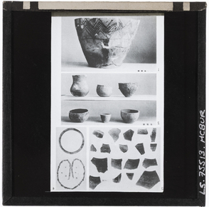 Documentary photograph of seven pottery vessels, incised po…