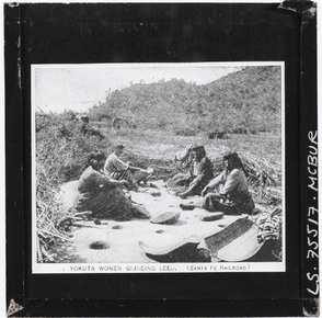 Four Yokuts women sitting on a large boulder with stones? a…