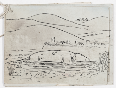 Pen and ink drawing of a carved rock or megalith known as U…