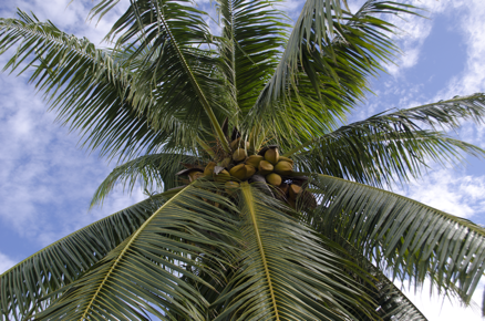 View of the top of a coconut palm, with coconuts nestled am…