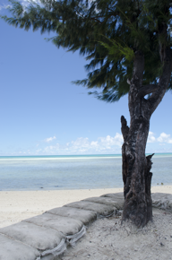 View of a tree on a sandbag platform overlooking the beach.…
