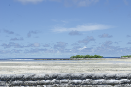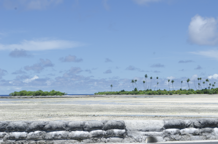 View over a sandbag wall to a coral reef and lagoon with la…