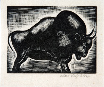 Etching of a black bull, possibly a Spanish bull. The prin…
