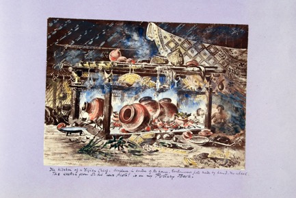 “The kitchen of a Fijian Chief. Fireplace in centre of the …